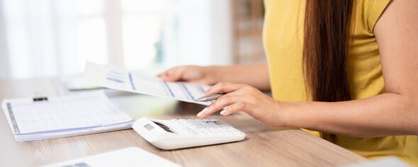 Woman renter holding paper bills using calculator for business financial accounting calculate money bank loan rent payments mana