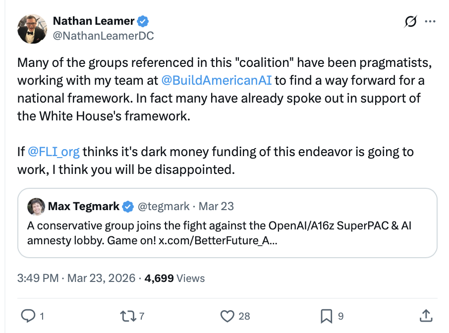 But within hours, it drew fire from another high-powered Republican: Nathan Leamer, an alumnus of the GOP-aligned digital agency Targeted Victory, a former policy adviser to FCC chairman Ajit Pai, and the executive director of Build American AI, an advocacy group connected to the pro-AI industry super PAC Leading the Future. (Major donors to the $100 million committee include Andreessen-Horowitz, OpenAI president Greg Brockman, and Palantir cofounder Joe Lonsdale.) He specifically took issue with the fact that Max Tegmark, a prominent AI safety advocate and the founder of the influential Future of Life Institute (FLI), had retweeted ABF’s announcement and positioned the group as a counter to the equally-influential Andreessen Horowitz crowd.