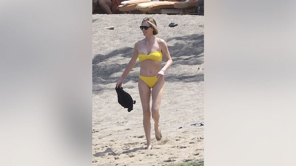 In the photos, Theron could be seen walking on the white sand beach in a strapless yellow bikini, which she paired with black sunglasses.