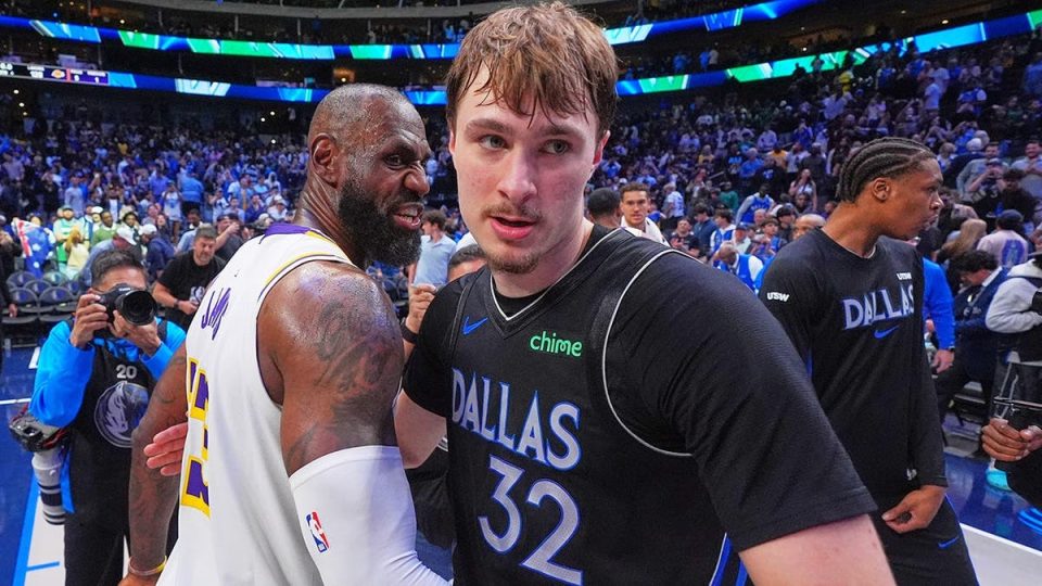Dallas Mavericks forward Cooper Flagg hugging Los Angeles Lakers forward LeBron James on basketball court