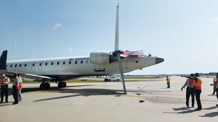 A damaged Endeavor Air plane on the tarmac at Hartsfield-Jackson Atlanta International Airport after a collision Tuesday.Nathan Pike / KSHB