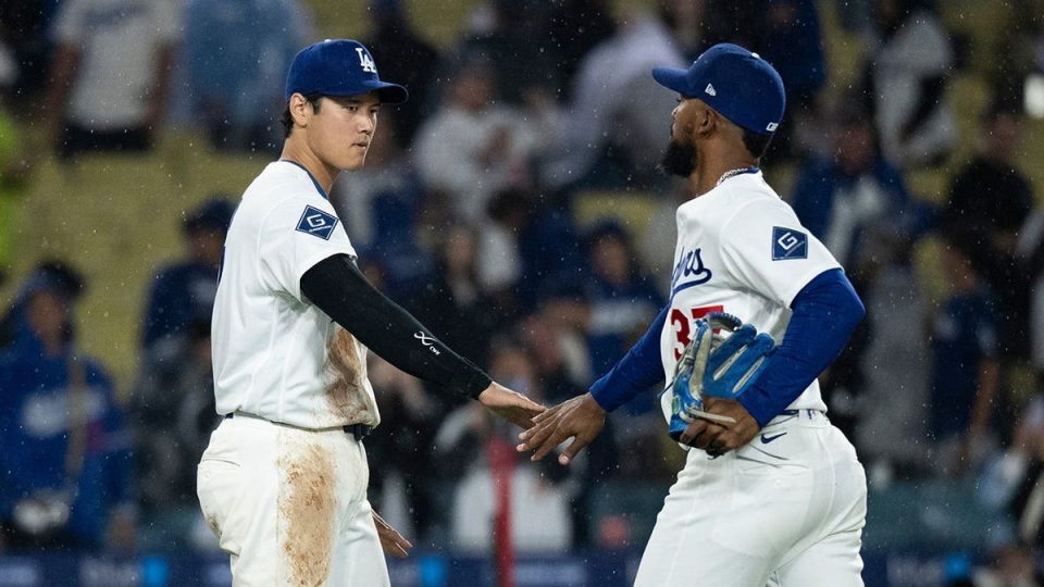 Los Angeles Dodgers’ Shohei Ohtani and Teoscar Hernández celebrate their team’s win over the Cleveland Guardians in Los Angeles on March 31, 2026. (Kyusung Gong/AP)
