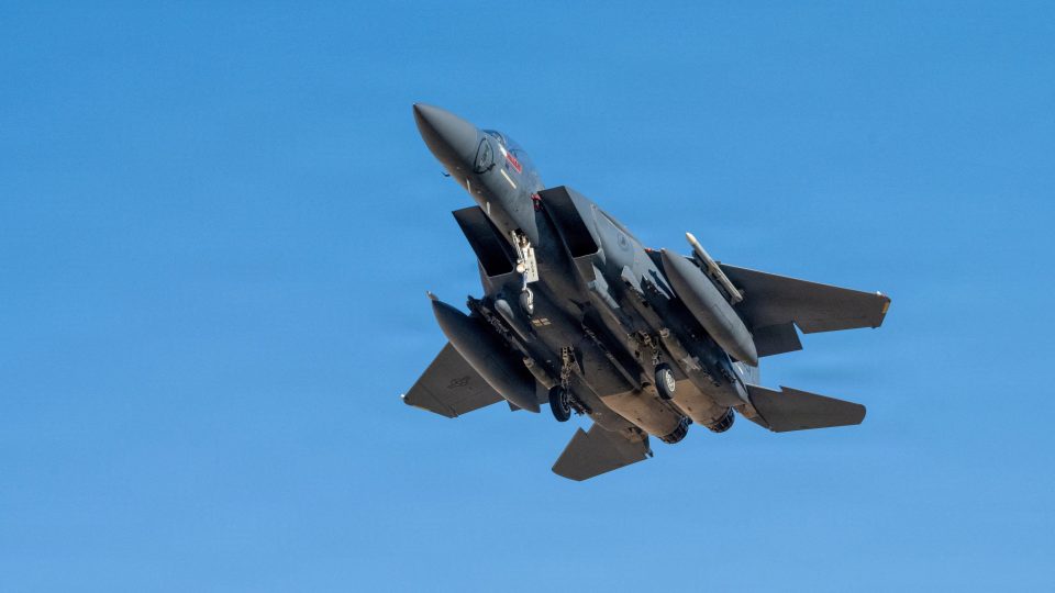 A U.S. Air Force F-15E Strike Eagle aircraft takes off for a mission supporting Operation Epic Fury during the Iran war at an undisclosed location, March 9, 2026.