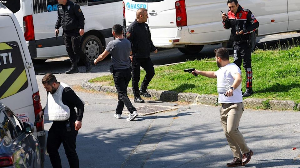 A plainclothes police officer holds a gun after gunfire was reported near the building housing the Israeli consulate in Istanbul, Turkey, on April 7, 2026. (Murad Sezer/Reuters)