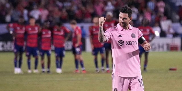 Lionel Messi, #10 of Inter Miami CF, celebrates after making his penalty kick attempt during the Leagues Cup 2023 Round of 16 match between Inter Miami CF and FC Dallas at Toyota Stadium on Aug. 6, 2023 in Frisco, Texas. (Alex Bierens de Haan/Getty Images)