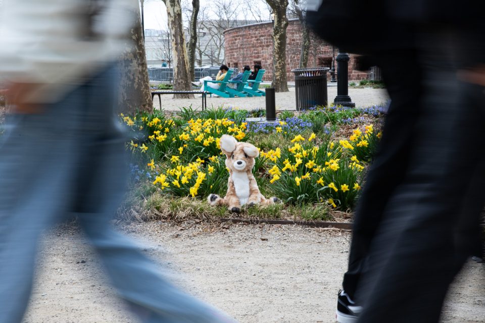 On a jaunt to the office, a small crowd of coworkers descended upon the plushie. Most recoiled, but a few decided to interact. One asked if Coral was always recording and listening. Somewhat conveniently and in character, Coral did not understand the query. Later, I took Coral to Battery Park. Plopping the plush into a field of daffodils, a veritable horde of children rushed up to pet it as I hovered nearby. Their faces lit up when the ears moved. Conversely, I watched one woman shriek before pulling her friend’s sleeve. “Did you see that shit?!” Both whipped out their phones to record the incident.