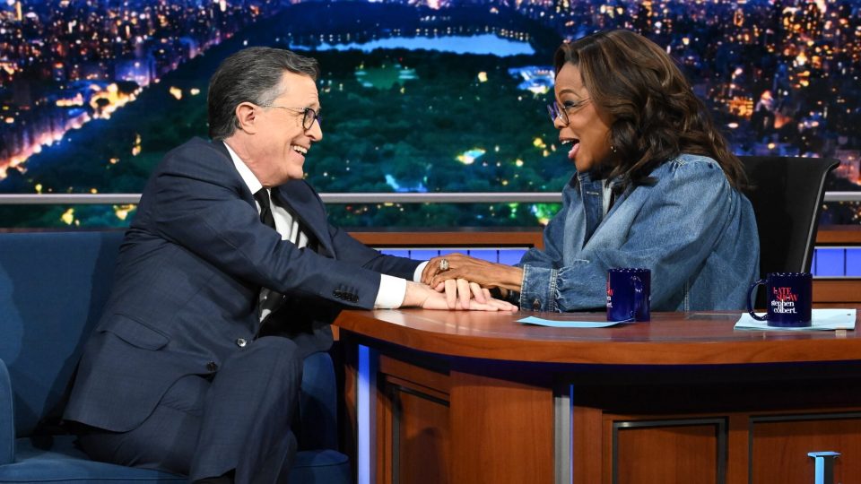 Colbert, 61, welcomed Oprah Winfrey, 72, as one of his final guests before his CBS show goes dark next month.