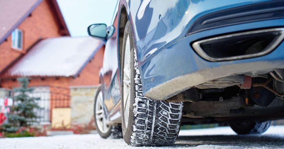 Car with winter tires parked on snowy road near house